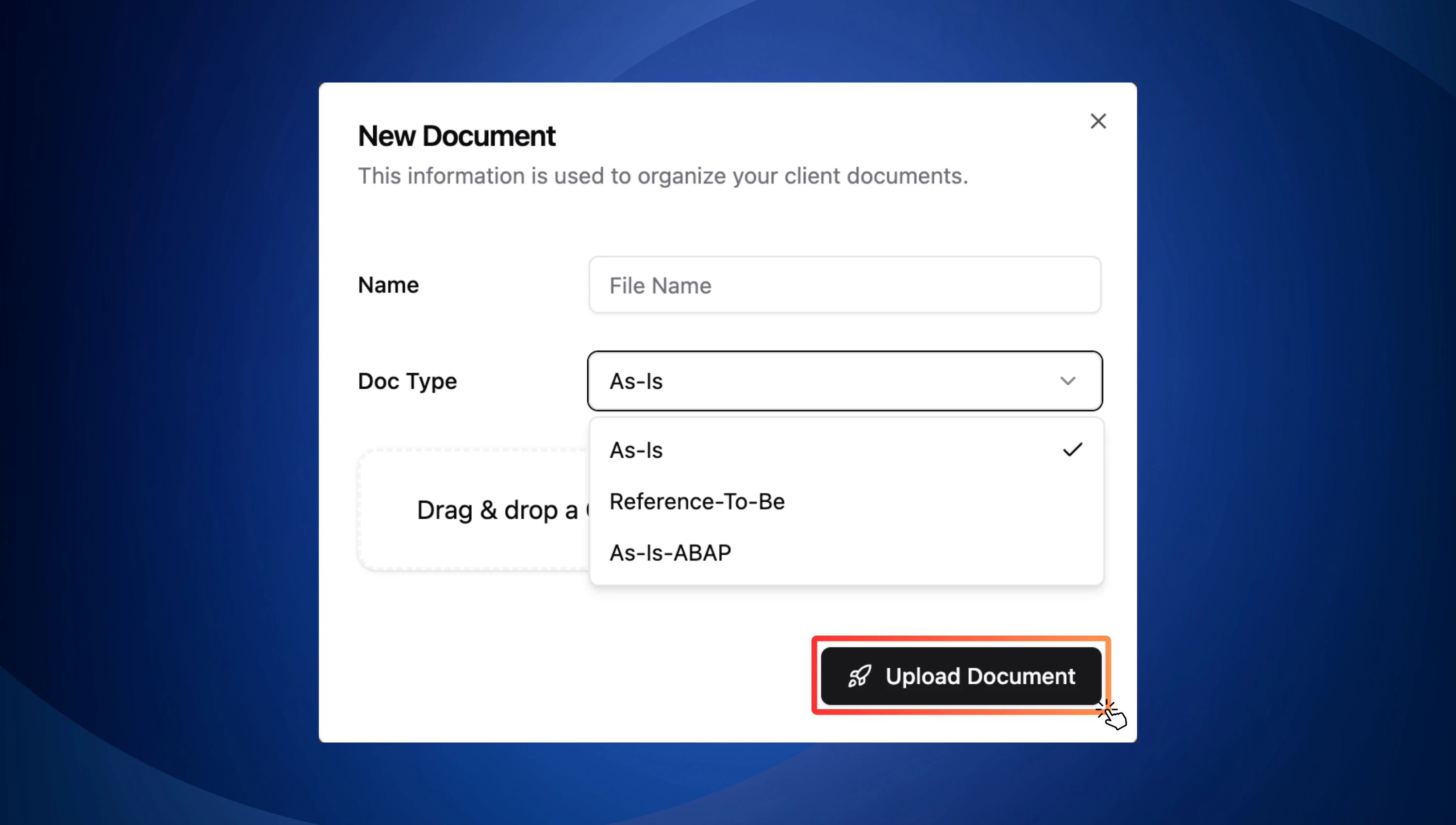 Document Type How it helps? Allowed file formats As-Is Describes the current system landscape and business processes .pdf, .docx Reference-To-Be Represents target design/process scenarios .pdf, .docx As-Is-ABAP Contains legacy ABAP code .abap